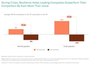 In any given industry, resilience has helped leading companies outperform their peers in terms of TSR by even more than usual during crises. (See Exhibit 1.) In stable quarters, the average gap in TSR between the 75th and 25th percentile performers in an industry is 16 percentage points. However, this nearly doubles to 30 percentage points in crisis quarters. The bottom line: the ability to perform well during crises, as enabled by resilience, has an outsized impact on shareholder return.